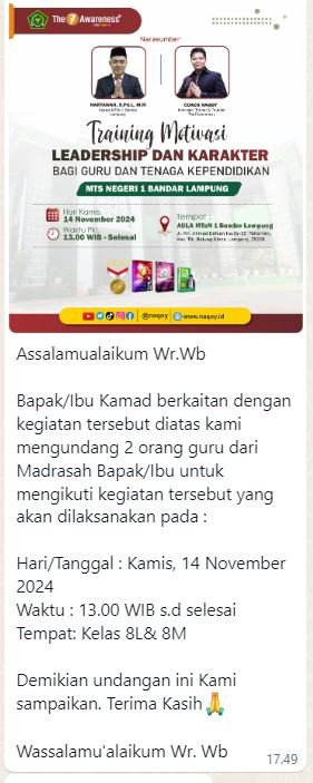 Undangan mengikuti Training Motivasi leadership dan karakter bagi guru dan tenaga kependidikan, Mts Hidayatul Islamiyah Mengutuskan 2 guru untuk mengikuti kegiatan tersebut, diatarnya NUR AGISTA, S.Pd DAN DESY AMALIA, S.Pd